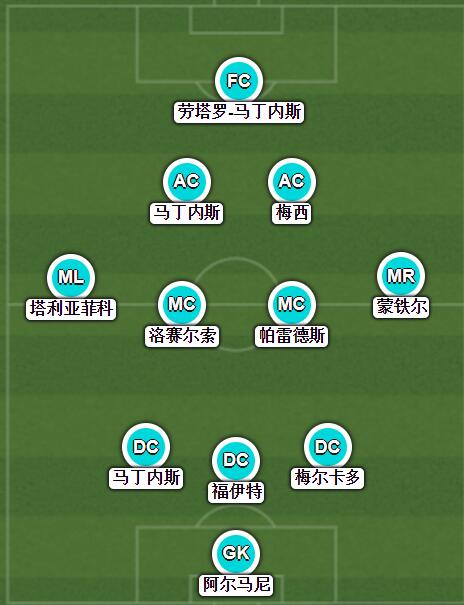 阿根廷首发:1-阿尔马尼、13-莫利纳、6-佩泽拉、19-奥塔门迪、3-塔利亚菲科、7-德保罗、5-帕雷德斯、8-阿里斯特、16-J-科雷亚、15-冈萨雷斯、10-梅西