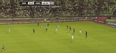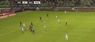 第6分钟,委内瑞拉进球!罗萨莱斯左路长传找隆东,后者接球后获得单刀机会,面对阿根廷门将阿尔马尼弹射破门,阿根廷0-1委内瑞拉!