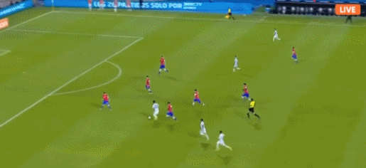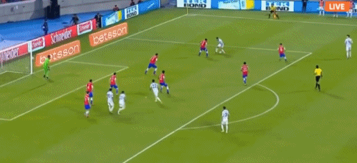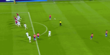 第2分钟,智利禁区前沿获得任意球机会,桑切斯主罚挑传到禁区内,前点队友头球冲顶没够到皮球,球稍稍偏出远侧立柱。