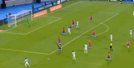比赛第44分钟,智利队进攻,保罗-迪亚斯禁区外接球,外脚背拔脚怒射,皮球划出一道诡异弧线,但被达米安-马丁内斯跃起扑出,阿根廷队逃过一劫,上半场比赛结束,双方暂时战成1-2。