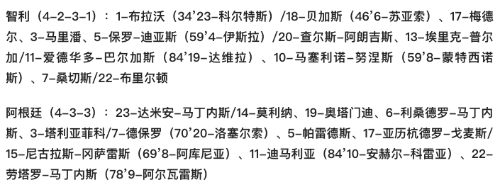 智利首发(442):1-布拉沃/4-伊斯拉、17-梅德尔、3-马里潘、2-梅纳/8-巴勃罗-加尔达梅斯(65' 10-皮纳雷斯)、13-普尔加、20-阿朗吉斯(86' 18-阿拉孔)、9-吉恩-梅内塞斯/11-爱德华多-巴尔加斯(81' 21-卡洛斯-帕拉西奥斯)、7-桑切斯