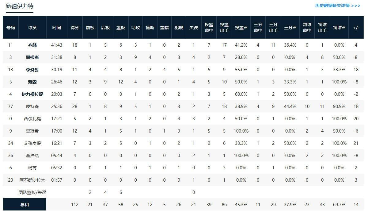 新疆伊力特昆汀-皮特森28分9板5助1断,齐麟18分6板3助,吴冠希12分5板1助1帽;