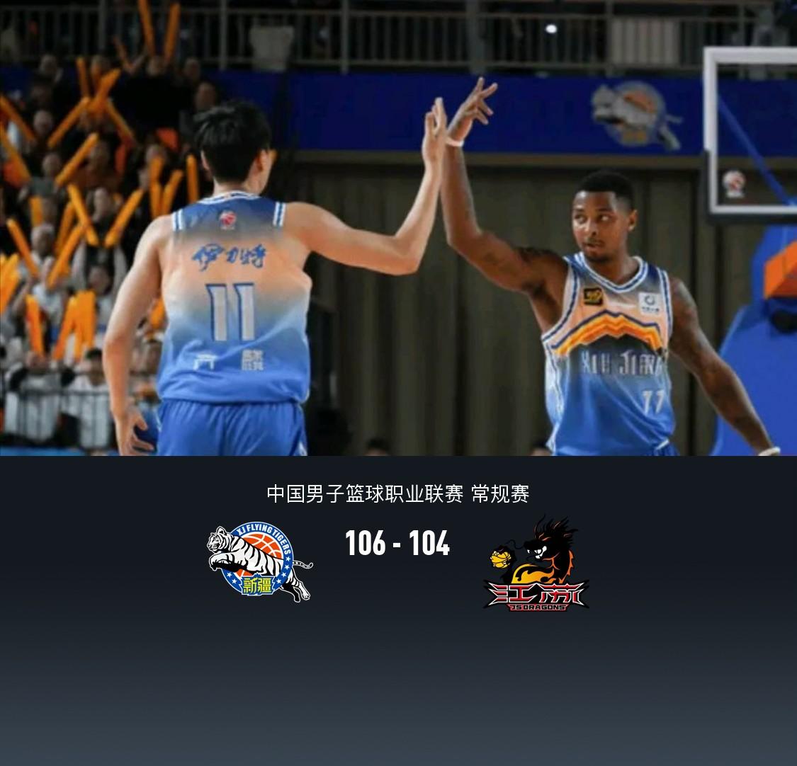 第四节新疆伊力福拉提-莫合坦尔拿下8分,江苏刘泽希拿下9分,最终新疆106-104战胜江苏
