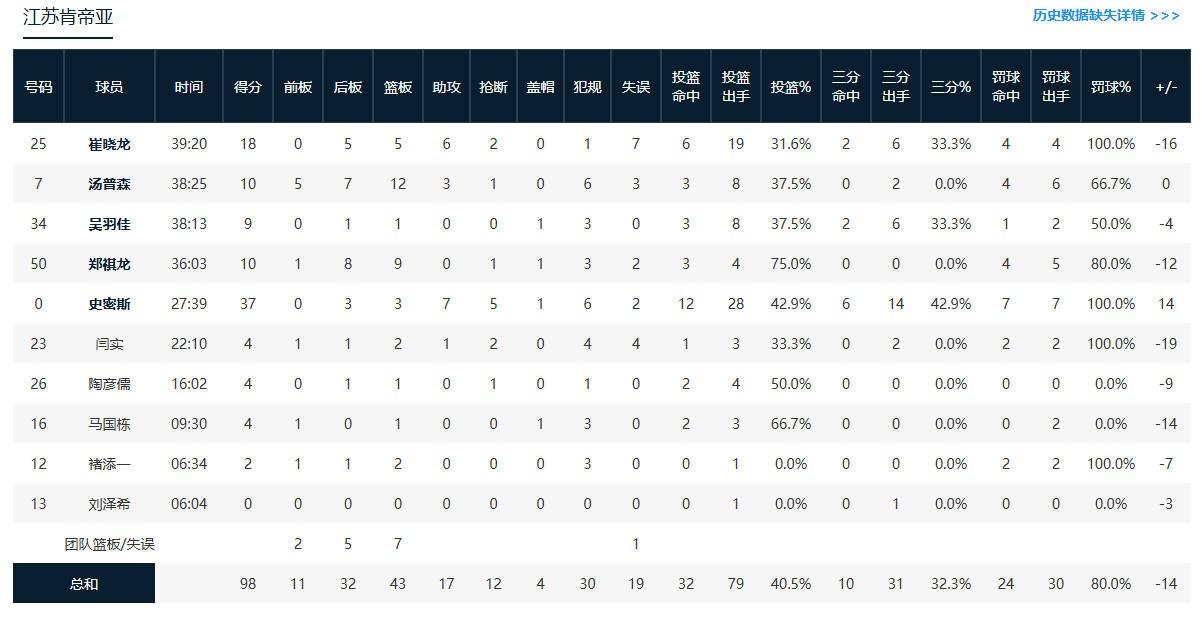 江苏肯帝亚特奎维恩-史密斯37分3板7助5断,崔晓龙18分5板6助2断,詹姆斯-汤普森10分12板3助。