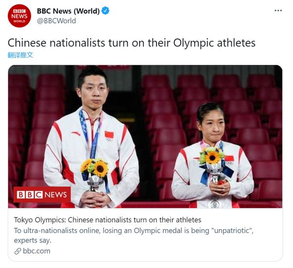 8月3日,BBC发表文章称,中国参赛选手的压力从未如此之大,只要没拿到金牌就会被中国民族主义者视为“不爱国”并遭受网络暴力。文章还称“中国乒乓混双选手刘诗雯因没拿到金牌而含泪道歉”,称“他们在混双决赛中输给日本而痛失该项目霸主地位引起了网络愤怒”,“中国社交平台上的‘键盘侠’抨击他们‘辜负了国家’”。