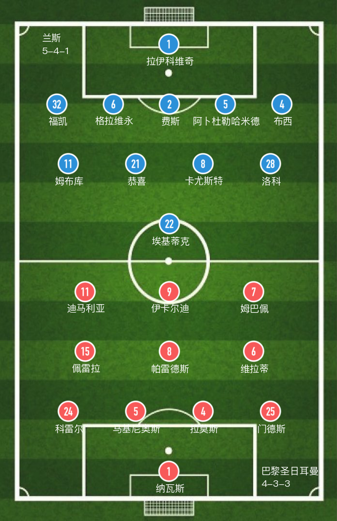 第6分钟,默尼耶起脚打门比较遗憾,没能没能在门框范围内。第15分钟,丁戈梅吃到黄牌。 第22分钟,奥丁起脚打门,被门将成功化解。 第22分钟,敦比亚起脚打门,球打的力度不错,但是偏出了球门。第25分钟,迪马利亚起脚打门,球有一定的威胁,但是偏出了球门。第27分钟,卡马拉起脚打门,被门将扑出。 第29分钟,卡法罗起脚打门,球有一定的威胁,但是偏出了球门。第36分钟,奥丁助攻巴巴攻入首粒进球兰斯1比0领先。 第39分钟,丁戈梅起脚打门有点遗憾,没能没能在门框范围内。第44分钟,德拉克斯勒吃到黄牌。 第50分钟,德拉克斯勒起脚打门比较遗憾,没能没能在门框范围内。第56分钟,敦比亚和卡法罗打出一波配合,卡法罗抓住机会破门得分,比分扩大到2:0。 第59分钟,卡瓦尼传球给姆巴佩,姆巴佩抓住机会破门得分,比分缩小到1:2。 第65分钟,姆巴佩起脚打门,球打的力度不错,但是偏出了球门。 第77分钟,阿尔维斯起脚打门,门将将球扑出。 第80分钟,门迪吃到黄牌。第93分钟,泽内里起脚打门,门将将球扑出。第96分钟,巴巴传球给查瓦里亚,查瓦里亚抓住机会破门得分,比分扩大到3:1。【出场阵容】