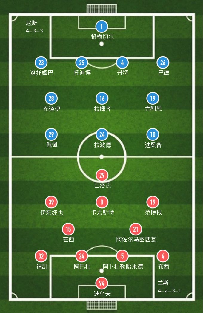 尼斯(4-3-3): 1-舒梅切尔,23-洛托姆巴,25-托迪博,4-丹特,26-巴德(90' 33-门迪),28-布道伊,16-拉姆齐(69' 11-巴克利),19-尤利恩,29-佩佩,24-拉波德(69' 35-布阿纳尼),10-迪奥普(69' 14-卜拉希米)