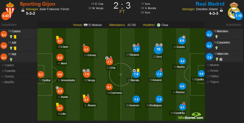 皇家马德里(4-3-3):13-卡西利亚/15-科恩特朗(57'12-马塞洛),4-拉莫斯,6-纳乔-费尔南德斯,23-达尼洛/10-J罗,16-科瓦契奇(89'14-卡塞米罗),22-伊斯科/20-阿森西奥,21-莫拉塔,17-巴斯克斯(71'18-马里亚诺)