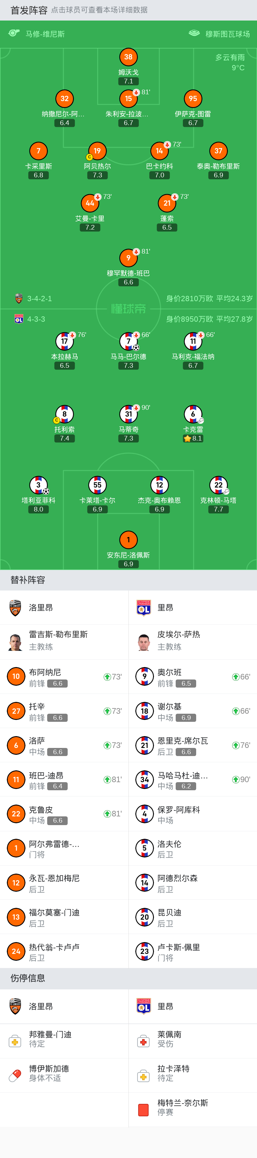 里昂 首发:31-马蒂奇, 3-塔利亚菲科, 1-安东尼-洛佩斯, 22-克林顿-马塔, 8-托利索, 55-卡莱塔-卡尔, 17-本拉赫马, 7-马马-巴尔德, 6-卡克雷, 12-杰克-奥布赖恩, 11-马利克-福法纳