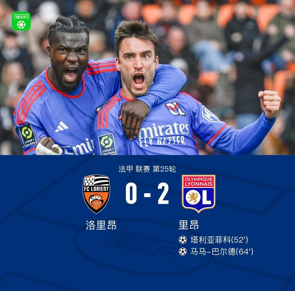 北京时间3月10日法甲 联赛 第25轮,洛里昂主场对阵里昂。上半场,托利索远射被门将扑出,穆罕默德-班巴低射打偏。下半场,塔利亚菲科头球破门,马马-巴尔德推射建功,最终,里昂客场2-0洛里昂。
