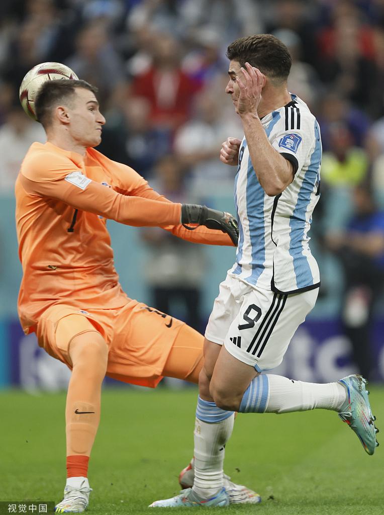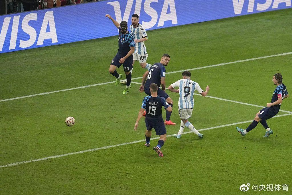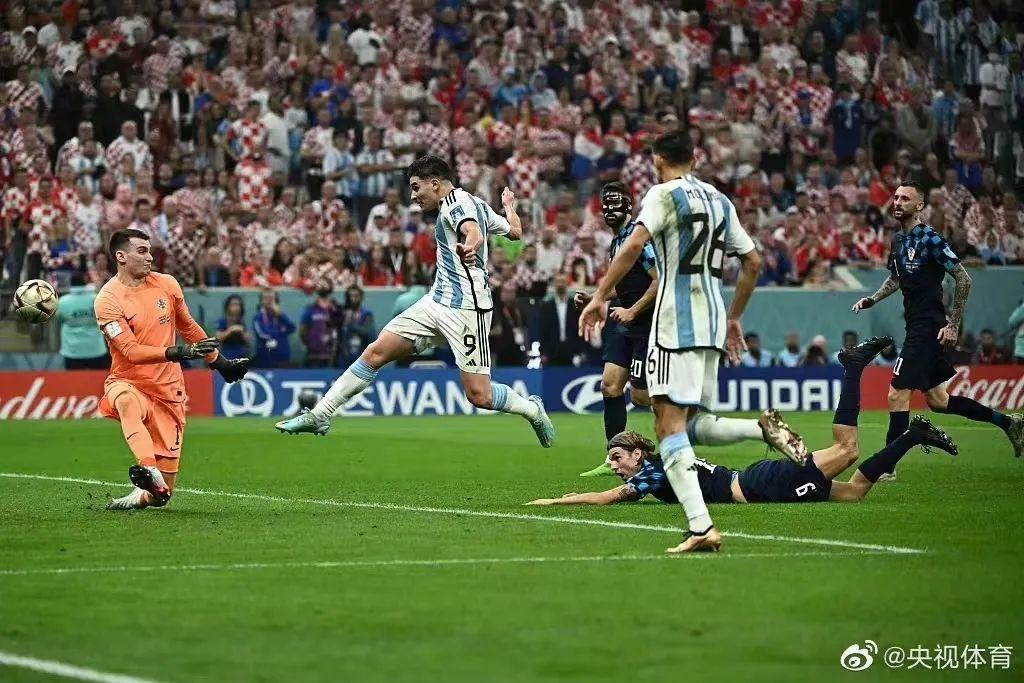 第38分钟,克罗地亚的防线在防守时没有将球处理干净,阿尔瓦雷斯一条龙单刀破门,阿根廷2比0领先。