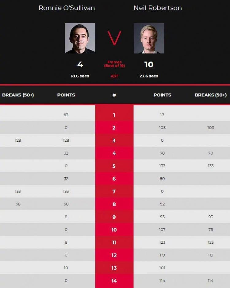 中场休息回来,罗伯逊71-12赢得缠斗,第六局罗伯逊打出单杆51分87-0胜出,随后奥沙利文及时止损,打出单杆90分还以颜色,第八局罗伯逊完成超分被逆转,奥沙利文做斯诺克追平比分,随后完成清台72-66险胜,罗伯逊错失良机,两次取得领先,都没做到趁势追击。