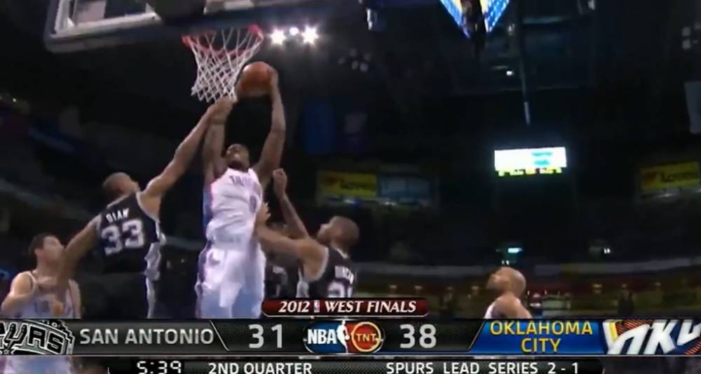 2012年西部决赛G6,雷霆107-99逆转拥有GDP和莱昂纳德的马刺,KD打满48分钟,17投9中,三分8中4,罚球15中12砍下34分14篮板5助攻。
