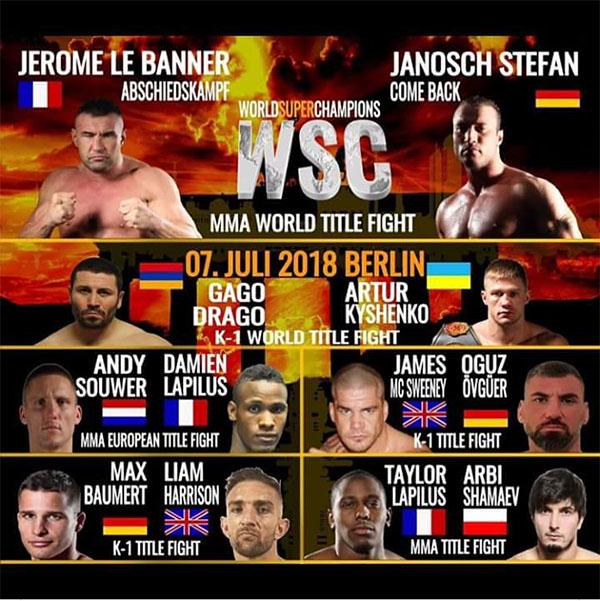 格斗迷网讯 欧洲格斗赛事WSC(World Super Champions)日前公布消息,将于今年7月7日在德国柏林举行大赛。K-1双冠王、修搏四冠王安迪·苏瓦 (Andy Souwer)、“美丽死神”阿尔图路·奇斯辛柯 (Artur Kyshenko)等世界名将均将出战亮相,届时将包括K-1和MMA两个规则。