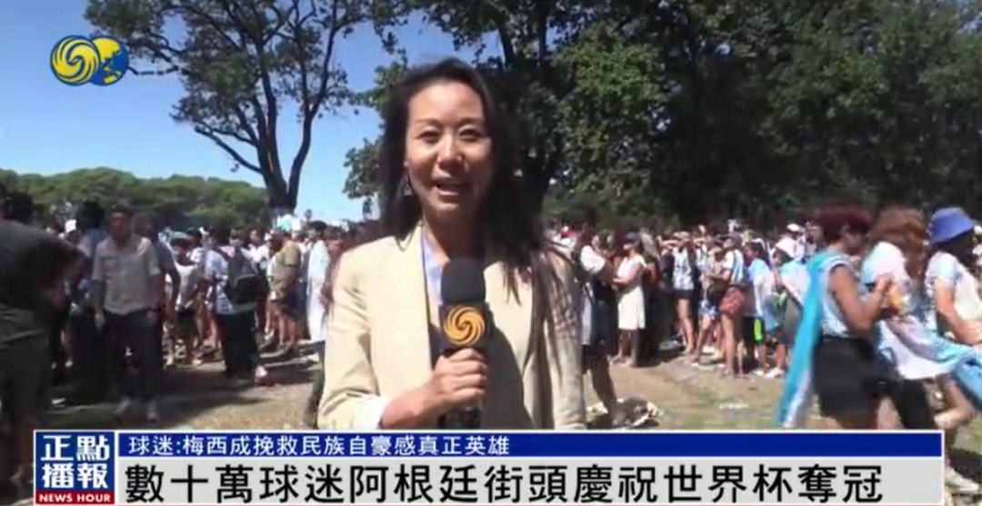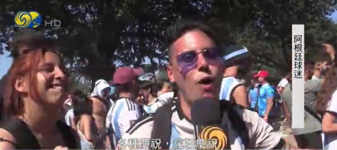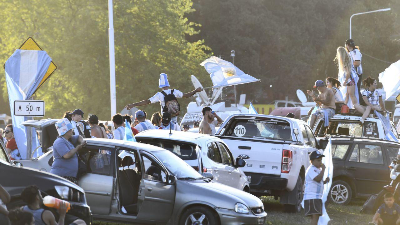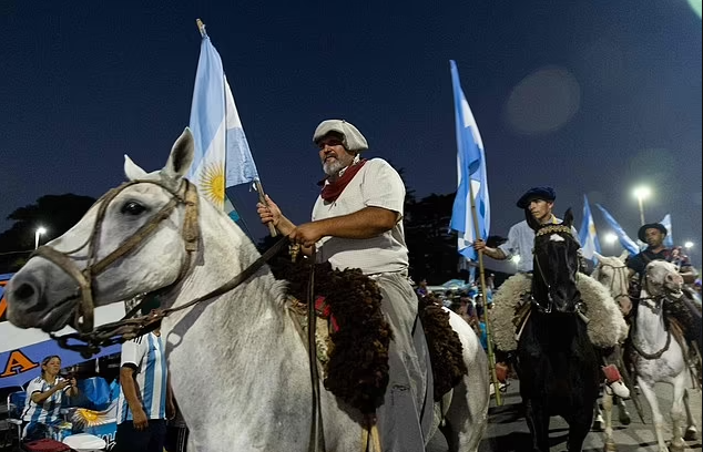 社交媒体上的视频显示,兴高采烈的球迷们在所有能挂国旗的地方挂上了阿根廷国旗,有人用起重机吊起了仿制的大力神杯,还有人骑在马上挥舞国旗。