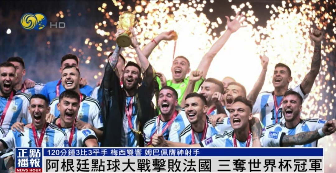 12月18日,2022卡塔尔世界杯决赛,阿根廷与卫冕冠军法国激战120分钟打成三比三平手;最终阿根廷凭借点球大战击败法国,第三次夺得世界杯冠军。