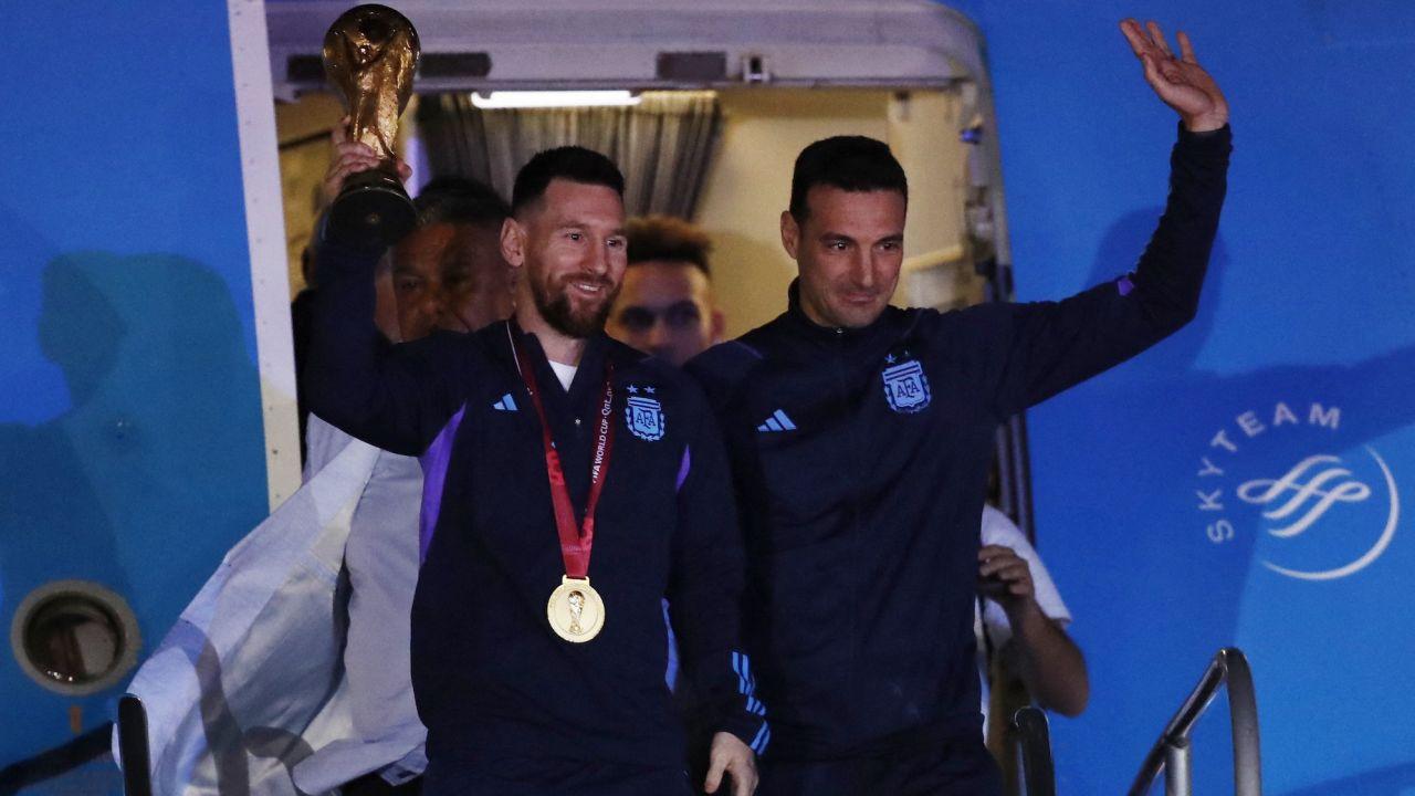 梅西高举大力神杯,率先走出飞机舱门。他的教练和队友们紧随其后,走上机场红毯,受到现场记者、官员和乐队的热烈欢迎。