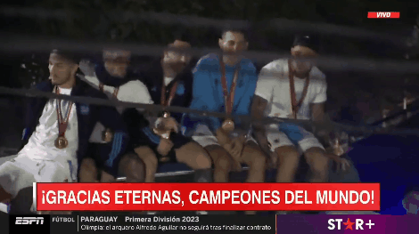 之后,阿根廷国家队乘坐敞篷大巴前往阿根廷足协总部,成千上万球迷的夹道欢迎。