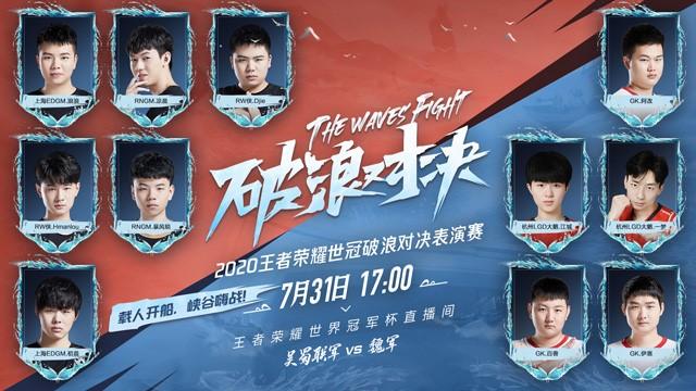 上海EDGM.浪浪、RNGM.凉晨、RW侠.Djie、RW侠.Hmanlou、RNGM.暴风锐、上海EDGM.初晨、GK.伊恩、GK.百兽、GK.阿改、杭州LGD大鹅.江城、杭州LGD大鹅.一梦十一位选手,组成吴蜀联军和魏军两队,按照“破浪对决”玩法规则进行对决,他们会带给我们怎样的精彩时刻?今日16:00,我们一起期待!