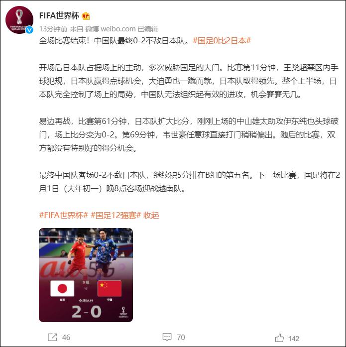 最终中国队客场0-2不敌日本队,继续积5分排在B组的第五名。