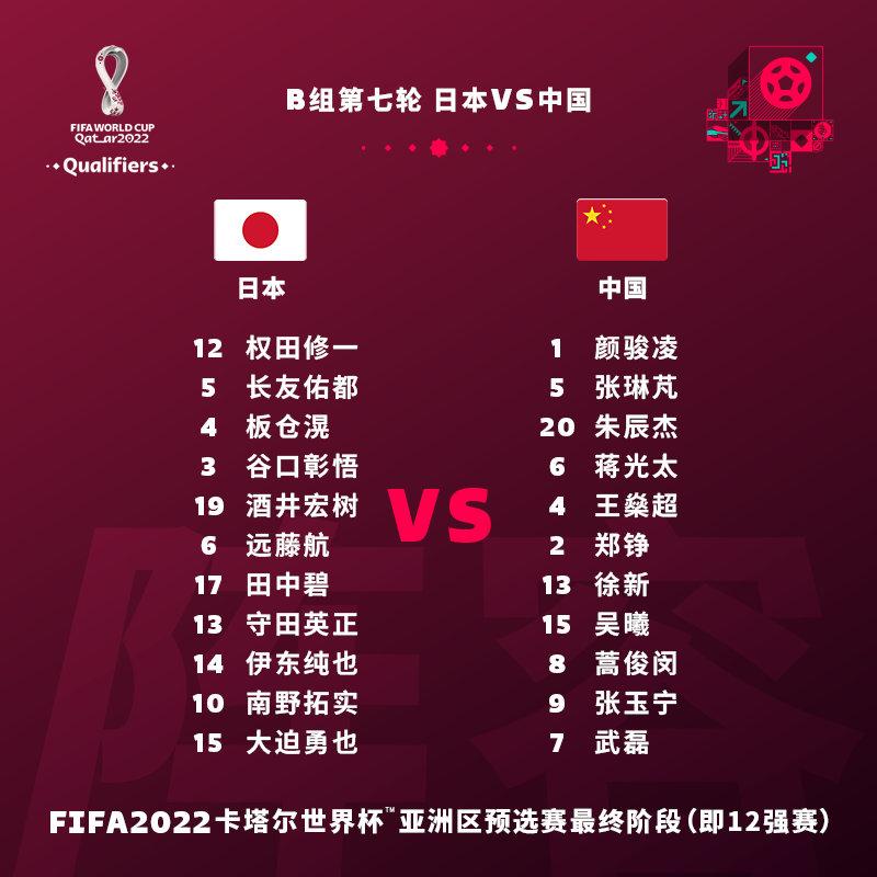 日本首发:12.权田修一(门将)5.长友佑都 4.板仓滉 3.谷口彰悟 19.酒井宏树 13.守田英正 6.远藤航 (队长)17.田中碧 10.南野拓实 14.伊东纯也 15.大迫勇也