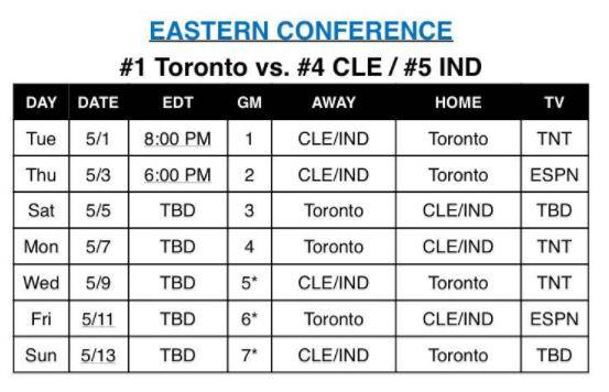 直播吧4月28日讯 据记者Josh Lewenberg消息,猛龙与骑士/步行者的半决赛前两场时间出炉。