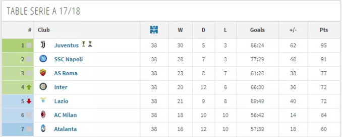 17/18赛季,那不勒斯的意甲积分达到恐怖的91分,他们从第17到第27轮连续坐在榜首,最终却只能以4分之差目睹尤文7连冠,以91分成为史上积分最高的意甲亚军。