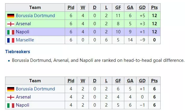 末轮生死战,伊瓜因和卡列洪进球,那不勒斯2-0击败阿森纳,但由于多特蒙德绝杀马赛,小组赛积12分的那不勒斯因胜负关系劣势遗憾出局。