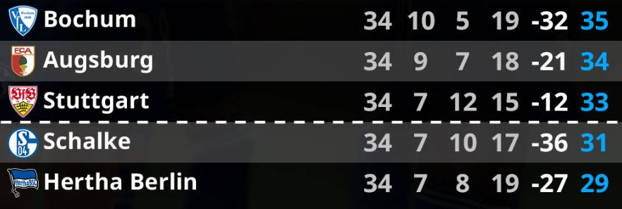 而在德甲降级方面,柏林赫塔垫底降级,沙尔克04在回归德甲首个赛季后即降入德乙,斯图加特末轮输球后降至第16将进行保级附加赛。