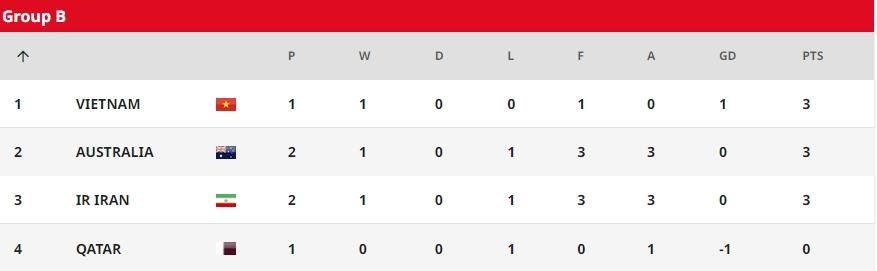 其余B组的比赛,伊朗首轮1-0小胜卡塔尔,但第2轮和澳大利亚的对决中,伊朗2-3不敌对手。越南队前2轮战罢后,以2胜的成绩领跑积分榜。