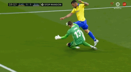 第60分钟,加的斯后场长传发动进攻,米利唐冒顶,卢卡斯-佩雷斯斜塞皇马中卫身后,内格雷多禁区内被出击的卢宁扑倒,裁判果断判罚点球。内格雷多亲自操刀主罚,被卢宁神勇扑出。