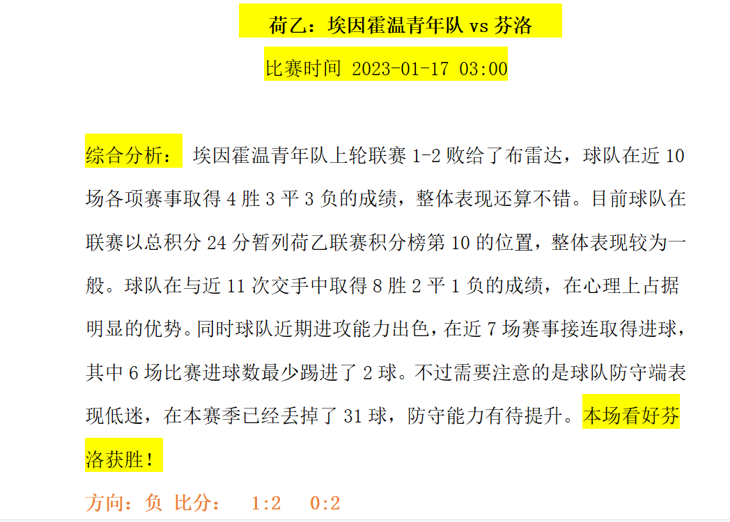 最近几个赛季,埃因霍温的年轻人实力有所下降,在联赛中也是垫底。本赛季,他们在前半段的发挥还算不错,目前取得了六胜六平七负的成绩,暂时排名第十,主场4胜1平4负,在抢分方面属于中游水平。青年军平均每一球都有1.6个以上的进球,而且球风很开放。在上一场比赛中,他们1-2输给了布雷拉,结束了2胜1平的不败纪录。