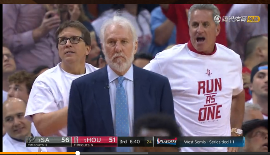 球打到这里,马刺这波攻击波被哈登一个人化解了,后面出现失误,并未续上。但是哈登得力不饶人,在自己的主场,他还要在嗨一会!(夜店里学到的,要嗨就要彻底,天不亮谁也别停)接下来的哈登发现找到手感后,在三分线外频繁移动,队友哪敢不给球?底角接球的哈登,手起刀落外加上往前稍微一靠,3+1!!!加罚命中比分逼近三分!如果你感受不到这球的神奇,就给你看看波波维奇的脸,给你看看防守哈登的米尔斯的脸。