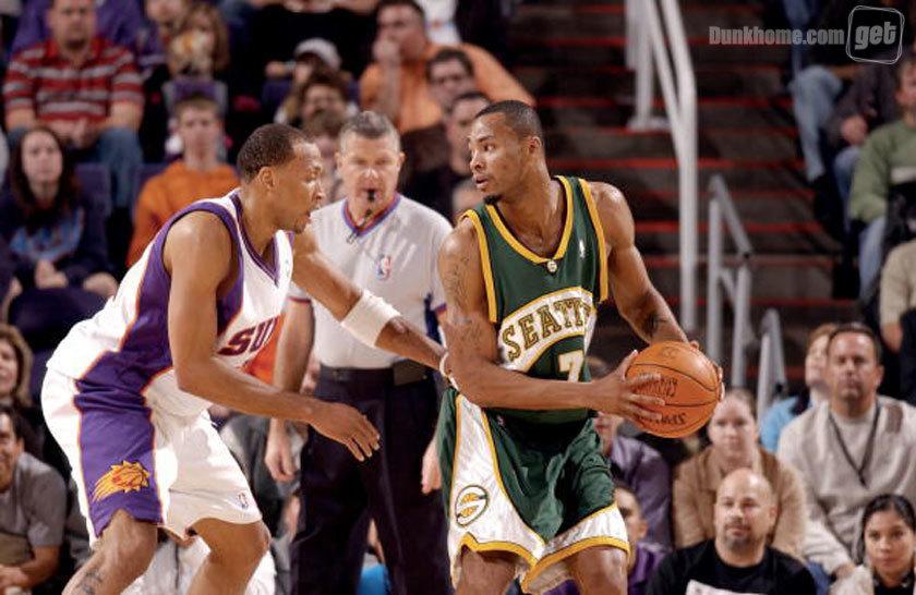 当时超音速做客对阵太阳,两队激战双加时才分出胜负。终场前2.5秒,双方战成149-149!雷-阿伦在Logo位置附近接到队友传球,往前运一步直接起身出手三分,皮球稳稳落入网窝!读秒绝杀!!!超音速以152-149险胜太阳,在客场全身而退!