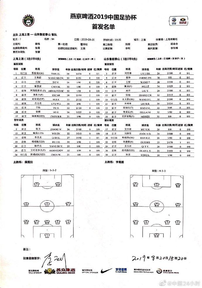 上海上港:1-颜骏凌/4-王燊超、5-石柯、6-蔡慧康、21-于海、28-贺惯/8-奥斯卡、37-陈彬彬/7-阿瑙托维奇、10-胡尔克、11-吕文君