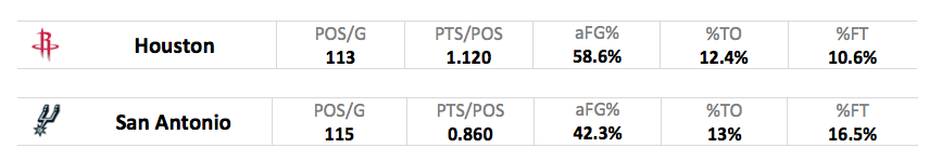 首先是数据总览,火箭本场比赛总共进行了113个回合,马刺因为多出4个前场篮板的原因则有115个回合,火箭平均每回合的得分高达1.12分,而马刺则只有0.86分,原因就是他们的有效命中率高达58.6%,而马刺则只有42.3%,两队的失误率则平分秋色。