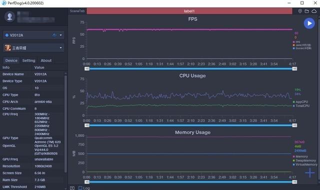 通过手机的游戏帧率记录来看,运行《王者荣耀》的过程中60帧是毫无压力的,游戏在运行过程中非常平稳无波动,iQOO作为王者荣耀职业联赛KPL的制定用机,在《王者荣耀》这款游戏的优化上倾注心血,这样的成绩也是意料之内。
