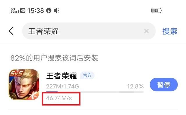 5G网络软件下载速度表现也是极为优秀的,通过vivo内置的官方商店下载游戏《王者荣耀》的速度为46.74MB/s。