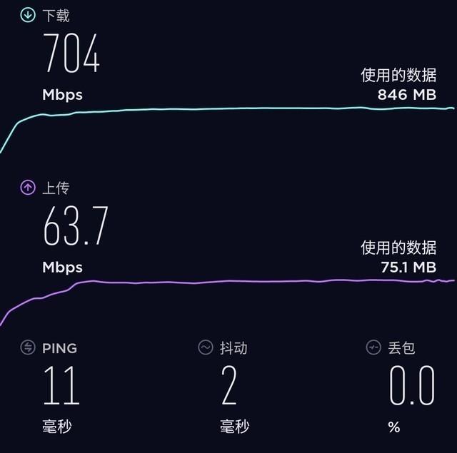 实测下5G的下载速率为704Mbps,上传速率达到了63.7Mbps,这个成绩符合联通5G套餐的网速。而这样的5G网络速度是大幅度优于4G网络的。