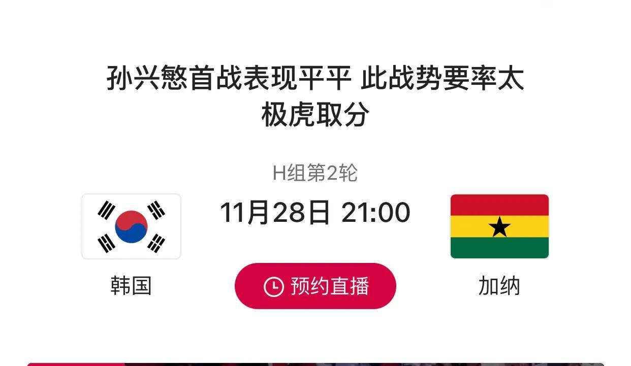 直播吧11月28日讯 北京时间11月28日晚上21:00,卡塔尔世界杯H组小组赛第2轮,韩国与加纳将在赖扬教育城体育场展开交锋。韩国与加纳在首轮小组赛皆以不胜开启了此次的世界杯之旅。韩国0-0战平乌拉圭、加纳2-3憾负葡萄牙这两场比赛,让两队在小组的形势上变得微妙起来,此番相遇,战果会如何呢?