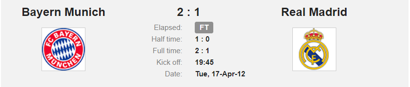 2012年4月26日,欧冠半决赛次回合,皇家马德里主场迎战拜仁慕尼黑(首回合拜仁主场2-1获胜)。上半场迪马利亚造点,C罗主罚首开记录,随后C罗破门扩大比分,佩佩送点,罗本主罚扳回一球。下半场戈麦斯错失绝杀机会。总比分3-3战平进入加时,加时赛双方均无建树,比赛进入点球大战,最终拜仁点球3-1获胜晋级决赛。