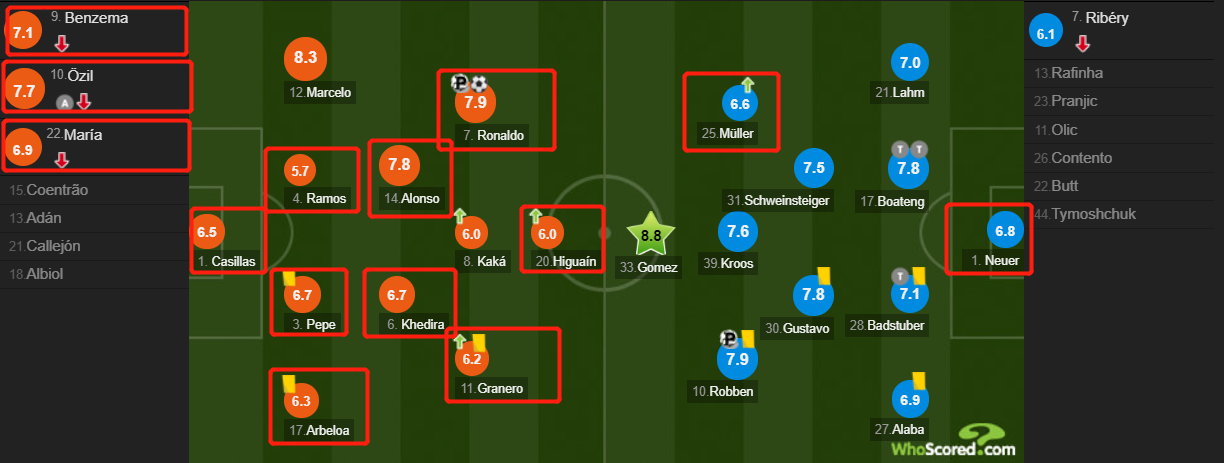 下图是双方第二回合比赛排出的首发,图中红色方框代表这名球员出战了上一场国内联赛。可以看到,皇马的首发除了左后卫马塞洛和替补出场的卡卡,剩下的所有球员都出战了上一轮与巴萨的联赛;反观拜仁这边,除了门将诺伊尔和加时赛才登场的穆勒,拜仁全队都在上一轮联赛得到了休息并未出战。皇马疲态尽显体能槽见底,拜仁则是养精蓄锐以逸待劳。