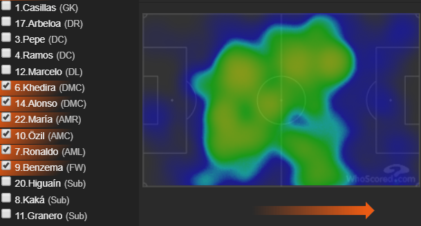 防守使整支球队的任务,并不只是后防线的职责。穆里尼奥深知这一点,如果仅仅依靠后防球员努力防守,那么后卫的体能将会马上消耗殆尽,那时球队后防将会形同虚设;然而如果让中前场的球员都回撤到更靠近本方禁区的位置,便可以利用小空间内的人员数量优势,在消耗较少体力的情况下,完成较好的防守效果。下图是本场比赛皇马首发中前场球员的跑动热度图,可以看到本职工作是发起进攻的皇马中前场,在面对拜仁时有超过50%的覆盖范围都是在后场,球员们都积极的回到本方半场参与协防,很好的完成了主教练的回撤安排。