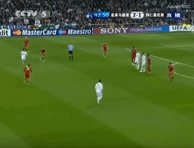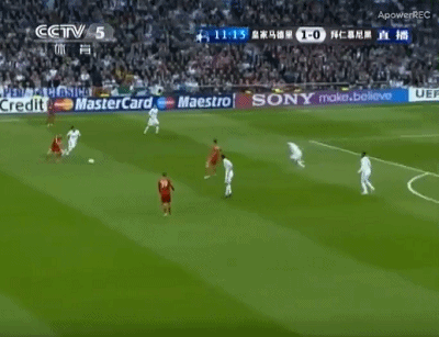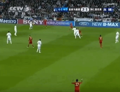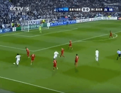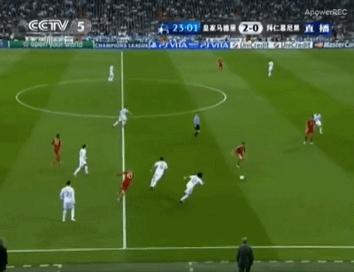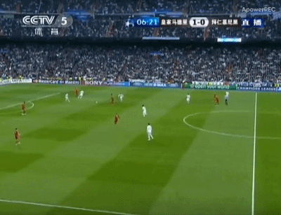 在上半场被拜仁的几次绝佳机会吓到后,皇马球员便大幅提高了防守注意力,加强回防速度和上抢积极性。从下面两次相隔仅仅一分钟的进攻可以看到,面对拜仁的冲击,皇马整个后卫线的回防到位速度非常快,几乎全队都是以最快的冲刺速度杀回禁区进行防守;而在阵地战中,皇马中场在禁区前沿30m处便开始针对拜仁球员积极拼抢,减少威胁向禁区蔓延的可能性。