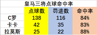 皇马派出的点球大战名单突出一个“稳”字,C罗、卡卡、拉莫斯都是各自国家队的第一点球手,脚法出色且心理素质强大,几乎可以说是百发百中。根据笔者统计,C罗、卡卡、拉莫斯的点球命中率分别为84%、83%和88%,如果三人同一场比赛同时罚丢点球,那么这个概率会是0.16*0.17*0.12=0.3%,相当于被雷劈中的几率。