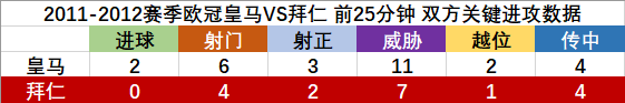 根据笔者对本场比赛前25分钟双方的关键进攻数据的记录,可以看到两支球队都打出了变态级别的火力,射门数皇马6次,拜仁4次,射正比3-2,威胁球对比高达11-7,双方各有2次和1次越位,都有4次传中。这种在个别沉闷的比赛中打满全场才会得到的数据,两支球队在短短25分钟就完成了。如此高强度的对攻,穆里尼奥对体能的担忧不无道理。