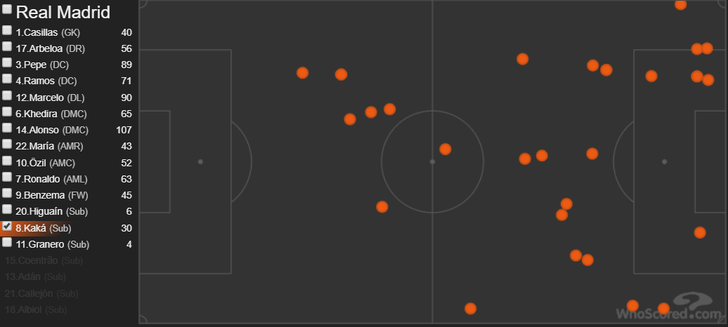 穆里尼奥早就预料到球队进攻端的体能问题,于是将精疲力尽的迪玛利亚换下,换上了前腰卡卡,希望体力充足的巴西人能够带动球队冲击拜仁防线。然而在皇马的卡卡一直都没能回到过去米兰的荣光,本场比赛卡卡的表现非常平庸,下图是卡卡这场比赛的触球位置分布,可以看到被替换上场的他几乎没有给对手造成任何实质性威胁。