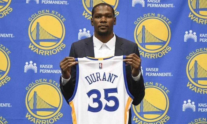 2016年的夏天,杜兰特宣布离开效力了9年的雷霆,并加盟金州勇士。