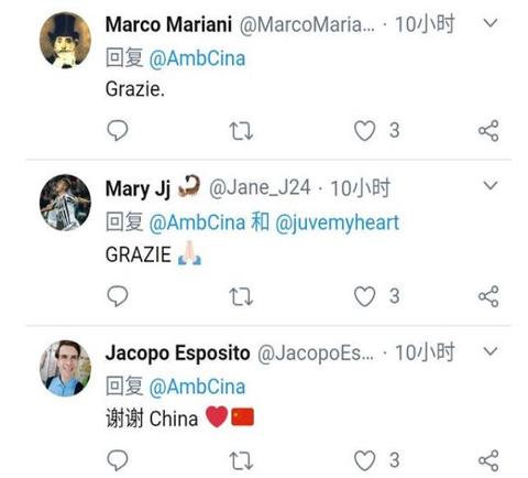 中国驻意大利共和国大使馆的官方推特就中国抗疫医疗专家组抵达米兰的新闻发布了多条推文和视频,每一条下面都有很多意大利网友留言,其中提及频率最高的词是“Grazie”(意大利语:谢谢)。“谢谢中国帮助伦巴第大区对抗新冠病毒”“谢谢中国医生飞到米兰帮助我们应对意大利当前的危机”“感谢中国,希望每个人平安”“谢谢你”“你们让我落泪”意大利民众用母语、英语以及中文发自内心地对中国的支援表示感谢。