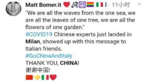 在他们之中,意大利女子阿丽西注意到,中国抗疫医疗专家组抵达米兰后亮出的一条横幅。“横幅上的意大利语写着‘我们是同海之浪,同树之叶,同园之花’。”同样提到这句话的还有网友马特·博梅尔,他表示:“中国的专家刚刚抵达米兰,他们向意大利的朋友们传递了这样一条信息。”这句话意大利人都很熟悉,因为它正是来自古罗马哲学家塞内加。